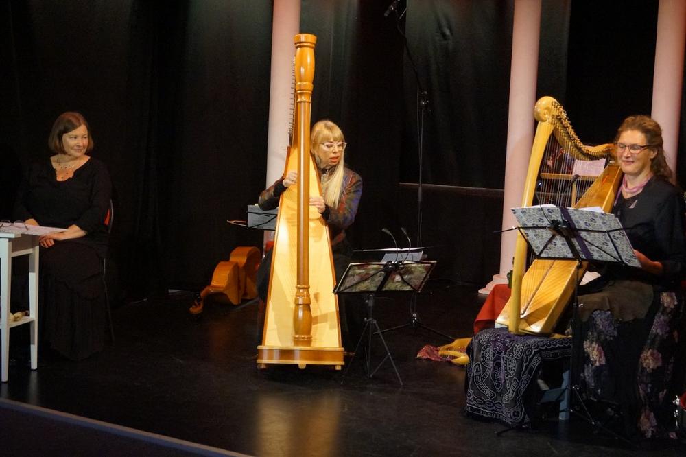 Am Freitagabend wimmelte es in der Bühne am Schardthof nur so vor Zwergen, Hexen, Feen und sonstigen Märchengestalten. Aber Gott sei Dank nur in der Fantasie der Besucher, die durch die vorgetragenen Märchen von Nathalie Greiner und dem zauberhaften Spiel und Gesang von Fiorella Pratelli und Kornelia Arnold in diese Traumwelt entführt wurden. Die drei Damen vom „Ensemble ELIZA“ boten dem Publikum mit „Der Verzauberung des Zauberers Merlin“ ein abwechslungsreiches Programm mit romantischen Liedern und sanften Melodien aus Irland, Schottland und der Bretagne. Der keltischen Harfe kam dabei ein wichtiger Part zuteil, denn mit diesem traditionellen Instrument von der grünen Insel gelang es den Musikerinnen eine bezaubernde Atmosphäre in den Schardthof zu bringen. Und so manchem kam der Song „Scarborough Fair“, ein traditionelles englisches Volkslied, bekannt vor. Es erschien 1966 auf dem Album Parsley, Sage, Rosemary and Thyme von Simon & Garfunkel die dem Lied einst zu Weltruhm verhalfen. Seit diesem Abend wissen die Besucher allerdings, welche Geschichte hinter diesem Song steckt, denn Nathalie Greiner erzählte die Geschichte von einem ehemaligen Liebespaar, das sich nun gegenseitig unlösbare Aufgaben stellt, um wieder zu einem Paar werden zu können.