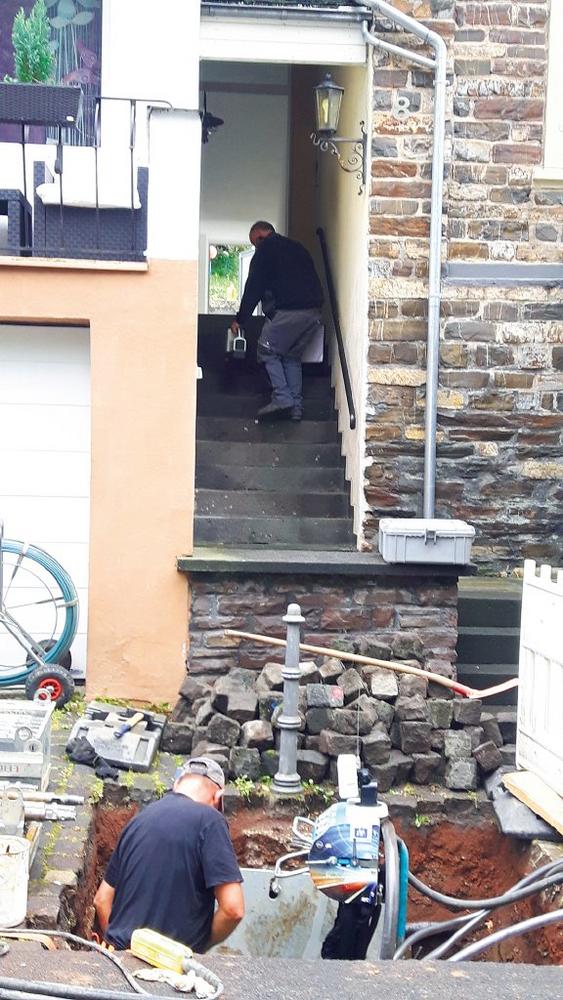 Für die neue Wasserleitung wurden Schutzrohre vom Typ PE DN 50 sowie Wasserrohre PE DN 40 eingezogen. Aus einer kleinen Grube in der 46 Meter entfernt liegenden Straße arbeitete sich der GRUNDOPIT mit dem „Hard Drill Head“ HDH durch den Untergrund bis zur Zielgrube. Der Boden zeichnete sich durch eine sehr inho-mogene Beschaffenheit aus: Fels, Lavagestein und lehmige Schichten wechselten sich oft unvermittelt ab. Die Pilotbohrung für den Hausanschluss mit Durchmesser 88 mm verlief unter bestehender Bebaung steil einen Hang hinauf – zunächst unterhalb von Treppen, unter einem Hausflur und einer gepflasterten Terrasse, einem Gartenbeet, einer Wiese und verschiedene Wegen, bevor der Bohrkopf schließlich am Endpunkt die Zielgrube erreichte. Die Bohrung verlief zwischen 1,0 und 3,5 Metern Tiefe und wies Neigungen bis zu 46 % auf. Bei der Räumbohrung wurde mit einem Mischungsverhältnis der Bohrspülung von 15 kg zu 1000 l Wasser gearbeitet, wie Oliver Pöllmann erklärte.