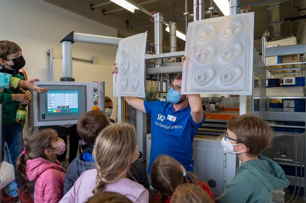 „Wir möchten mit diesem Tag auf unsere Branche aufmerksam machen und Kinder für das Thema Kunststoffe sensibilisieren und begeistern“, sagt Bertold Zugelder, Marketing-Chef am SKZ. Einmal im Jahr veranstaltet die „Sendung mit der Maus“ ihren sog. Türen auf-Tag. Unternehmen haben die Möglichkeit, sich zu bewerben und ihre Türen für Kinder und Familien zu öffnen. Im Zentrum steht dabei das Thema Zukunftsgestaltung. Nach einem Jahr pandemiebedingter Pause konnte der Türen-auf-Tag 2021 wieder stattfinden. Und nicht nur deshalb war er etwas ganz Besonderes: In diesem Jahr feiert die „Sendung mit der Maus“ ihren 50. Geburtstag. Das SKZ war erstmals dabei. „Wir haben uns gedacht, das passt einfach klasse – die Maus wird heuer 50, und das SKZ wird 60“, sagt Bertold Zugelder. „Wir haben uns daher beworben und es hat erfreulicherweise auch geklappt.“ Die Nachfrage sei sehr hoch gewesen. „Wir waren innerhalb einer Woche ausgebucht“, sagt Bertold Zugelder zufrieden.  Insgesamt 67 Kinder zwischen acht und zwölf Jahren hatten mit ihren Eltern – aufgeteilt in vier Gruppen – somit für eine gute Stunde Gelegenheit, in die Welt der Kunststoffe einzutauchen.