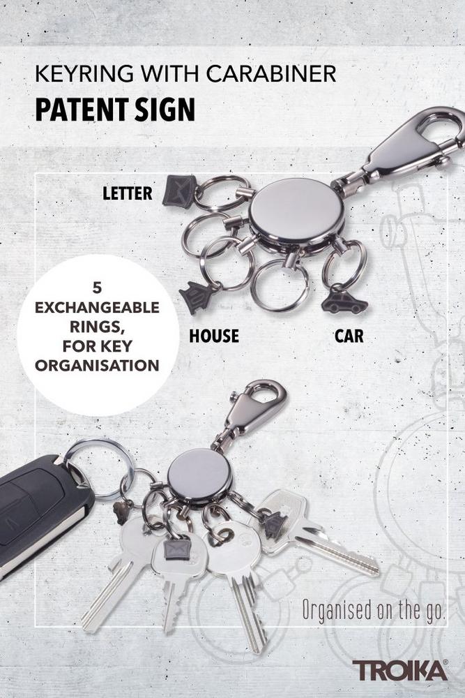 Timeless design meets intelligent functionality: the PATENT keyring is one of the most sought-after products in the TROIKA range. A reliable companion in everyday life – thanks to high-quality materials and precise technology. In the SIGN EDITION with five detachable rings and small motif pendants in gun metal. House, letterbox, car – my home is my castle.