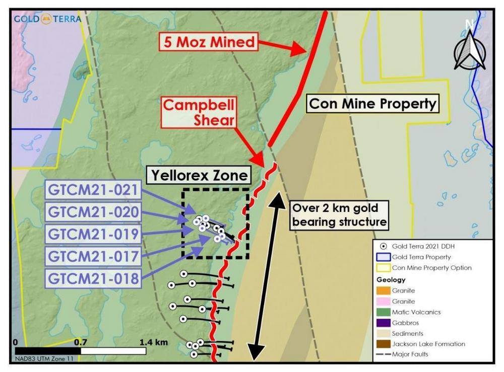 Das Phase-2-Bohrprogramm begann am 16. Juli; bis dato wurden zehn (10) Löcher mit einer Gesamtlänge von etwa 4.430 Metern gebohrt. Die Bohrungen erproben die Campbell-Scherung in der Zone Yellorex unmittelbar südlich der Mine Con auf einer Streichenlänge von 1 Kilometer und in einer Tiefe von 1.000 Metern. Bedeutende hochgradige Goldzonen wurden während des Phase-1-Bohrprogramms bei Yellorex (14,09 g/t Au auf 4,65 Metern, siehe Pressemitteilung vom 6. April 2021) und im ersten Bohrloch des aktuellen Phase-2-Programms mit Bohrloch GTCM21-014 (5,22 g/t Au auf 17,86 Metern, siehe Pressemitteilung vom 7. September 2021) durchteuft. Ziel der Bohrungen ist es, eine hochgradige Goldmineralressource abzugrenzen, um die aktuellen 1,2 Millionen abgeleiteten Unzen des Unternehmens zu erweitern (siehe den technischen Bericht mit dem Titel "Technical Report on the 2021 Updated Mineral Resource Estimates, Northbelt Property, Yellowknife City Gold Project, Yellowknife, Northwest Territories, Canada", der am 14. März 2021 in Kraft getreten ist und auf der Website des Unternehmens unter https://www.goldterracorp.com und auf SEDAR unter www.sedar.com eingesehen werden kann) und letztendlich eine Wirtschaftsstudie durchzuführen.