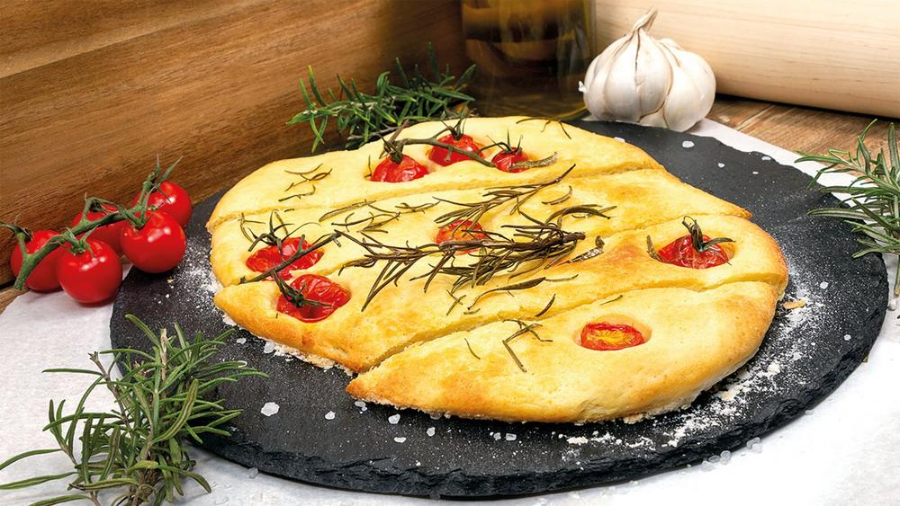 DerFocaccia-Teig kann nun in zwei Hälftengeteiltwerden.Diesewerden mit den Händen auf einem bemehltenBackpapierauf eine Höhe von circaeinemZentimeterausgebreitet. Anschließend Mulden in die beiden Teigfladen drückenundCherrytomaten in diese verteilen. Zuletztwird gehackterRosmarin mit Olivenöl vermischt und mit einem Pinsel auf denKartoffel-Focacciasaufgetragen. Beide Fladen kommenim Anschluss 25bis 30 Minutenin den vorgeheizten Ofen, bis siegoldbraunsind. Wenn beim Einstechenmit einemSchaschlikspießkein Teig am Stäbchen haften bleibt, sinddieKartoffel-Focacciasfertig.
