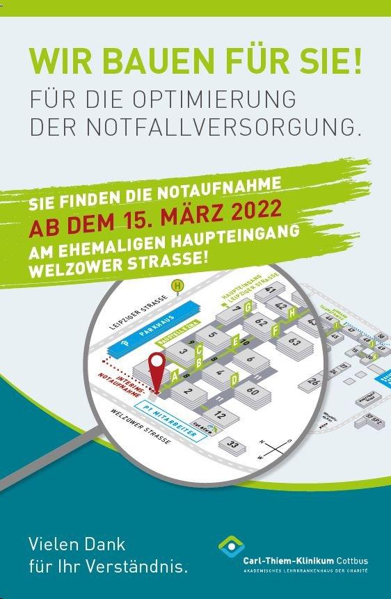 Dafür wird die Notaufnahme mit allen Behandlungsplätzen am kommenden Dienstag, den 15. März 2022 umziehen und ab 12 Uhr vom Eingang Welzower Straße erreichbar sein.