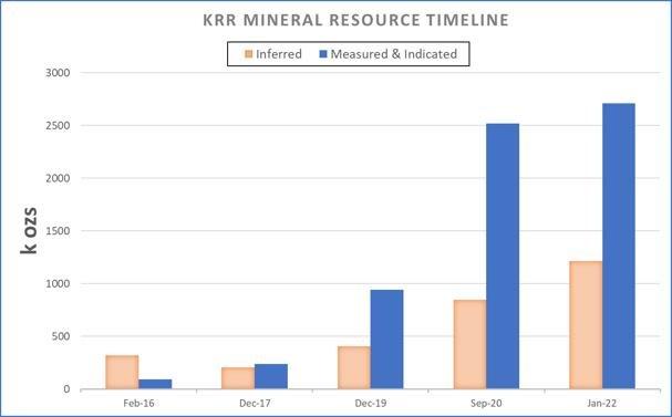 Am 31. Januar 2022 beliefen sich die gemessenen und angezeigten Goldmineralressourcen bei Higginsville auf insgesamt 31,71 Millionen Tonnen mit einem Gehalt von 1,6 g/t für 1.587.000 Unzen, was einem Anstieg von 121.000 Unzen oder 8 % gegenüber den gemessenen und angezeigten Ressourcen vom 30. September 2020 (1.466.000 Unzen) entspricht. Dieser Anstieg spiegelt vor allem eine erfolgreiche Bohrkampagne wider, die das Upgrade der historischen Mineralressource Spargos in die konsolidierte Mineralressource von Karora unterstützte. Am 31. Januar 2022 beliefen sich die abgeleiteten Mineralressourcen auf insgesamt 6,37 Millionen Tonnen mit einem Gehalt von 2,1 g/t für 428.000 Unzen Gold, was eine Steigerung von 118.000 Unzen gegenüber der Schätzung der abgeleiteten Mineralressourcen vom September 2020 von 310.000 Unzen bedeutet. Die konsolidierte Mineralressource Higginsville ist abzüglich der Minenproduktionserschöpfung von 0,6 Millionen Tonnen mit einem Gehalt von 2,1 g/t für 41.000 Unzen im Zeitraum vom 1. Oktober 2020 bis 31. Januar 2022.