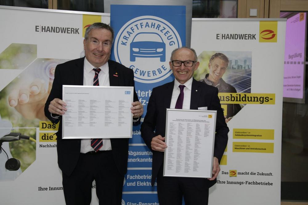 Thomas Bürkle, der Präsident des Fachverbandes Elektro- und Informationstechnik Baden-Württemberg, und Michael Ziegler, Präsident des Verbandes des Kraftfahrzeuggewerbes Baden-Württemberg, sind sich sicher: „Zusammen sind wir stärker.“ Stark genug, um den Kunden ganzheitliche Lösungen von den Kfz- und Elektroexperten vor Ort anbieten zu können. „Ziel der Kooperation ist vor allem der Austausch der Innungen, den regionalen Vertretungen von Kfz und Elektro, zu fördern und gegenseitiges Verständnis zu schaffen,“ begrüßt Thomas Bürkle die Kooperation. „Um unseren Kunden erstklassige Leistungen und ganzheitliche Angebote aus einem Guss liefern zu können, müssen wir verstärkt kooperieren.“ Michael Ziegler verweist darauf, dass Fachbetriebe beider Gewerke in Sachen E-Mobilität als Ausdruck gelebter Energiewende die primären Ansprechpartner für Bürger sind: „Wir sind die Schnittstelle zum Kunden. Egal, ob ein E-Auto gekauft oder zu Hause die Ladeinfrastruktur aufgebaut werden soll, er oder sie kommt zuerst zu uns.“