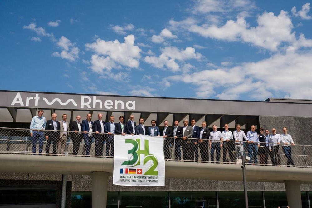 Foto: Auf dem Pressefoto sehen Sie die Mitglieder der neu gegründeten Trinationalen Wasserstoff Initiative 3H2 nach der Enthüllung des Logos.