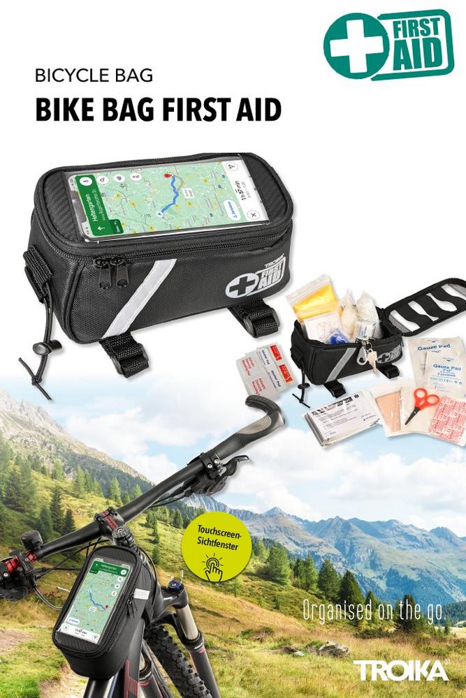 Fahrradtasche für den Rahmen inkl. Erste-Hilfe-Set und Smartphone-Halterung, flexible Befestigung mit Klettbändern, Touchscreen-Sichtfenster passend für gängige mobile Geräte zur Navigation (Elastikbänder), Inhalt: Regenponcho aus PE, 2x Polyester-Wundverband, 1 Mund-zu-Mund-Maske, 1 Paar Vinylhandschuhe, 2 Alkoholtupfer, 2 antiseptische Tücher (BAC), 2 Auflagen für Insektenstiche, 1 Rettungsdecke – silberfarben, 1 Dreieckstuch, 4 Mullkompressen, 27 verschiedene Pflaster, 1 Schere 9 cm, reflektierende seitliche Streifen, 100% Polyester, Nylon, matt, Schwarz