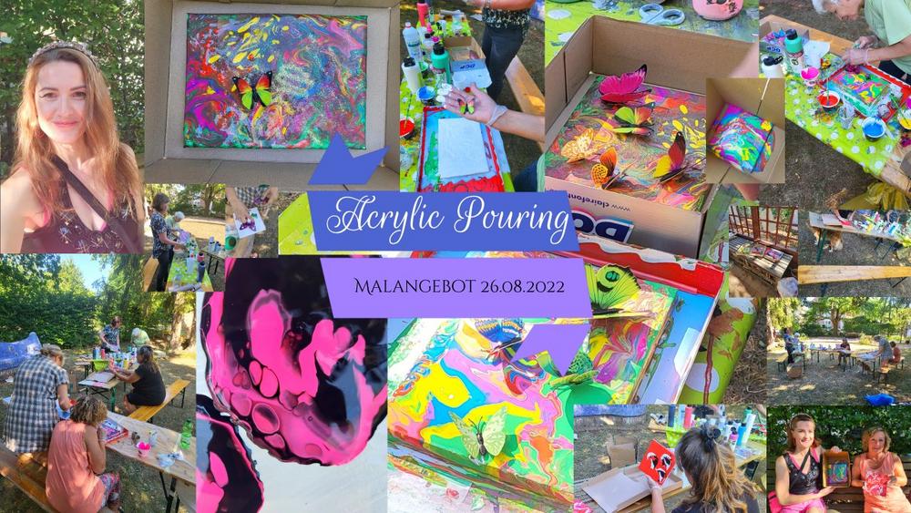 Während der Veranstaltung können Fragen gestellt werden und auch besondere Gestaltungen ausprobiert werden. Glitzer und Dekorations-Schmetterlinge bildeten die Highlights in der Dekoration der Bilder auf den letzten beiden Veranstaltungen zu Acrylic Pouring, die im Juli stattfanden. Auch diesmal können die Bilder nach Zerfließen der Farben zusätzlich dekoriert werden.