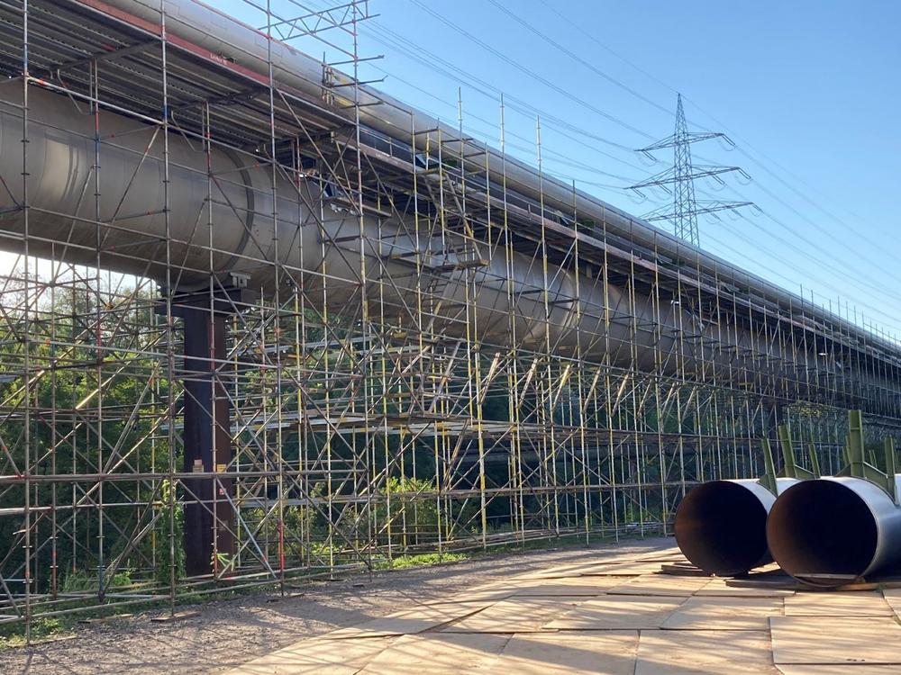 Die Demontagearbeiten auf der Rohrtrasse im Bereich der geöffneten Rohrleitung werden zur vorsorgenden Sicherheit der Mitarbeitenden mit Atemschutzgeräten durchgeführt. Für Personen unterhalb und neben der Rohrtrasse besteht keine Auswirkung.