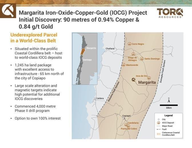 Torq Resources Inc. (TSX-V: TORQ, OTCQX: TRBMF) ("Torq" oder das "Unternehmen" – https://www.commodity-tv.com/ondemand/companies/profil/torq-resources-inc/) freut sich, die Identifizierung neuer hochrangiger Ziele auf dem Eisenoxid-Kupfer-Gold-Projekt Margarita im Norden Chiles, 65 Kilometer (km) nördlich der Stadt Copiapo, bekannt zu geben (Abbildung 1). Die östlichen Ziele Remolino und Cototuda wurden auf der Grundlage ähnlicher geologischer, geochemischer und geophysikalischer Merkmale definiert, wie sie im Entdeckungsbohrloch 22MAR-013R von Falla 13 beobachtet wurden, das 90 Meter mit 0,94 % Kupfer und 0,84 g/t Gold durchteufte (Abbildung 2). Insgesamt haben diese Ziele das Potenzial, neue Mineralisierungsbereiche jenseits des Strukturkorridors Falla 13 zu definieren, der zurzeit bebohrt wird, um die in Bohrloch 22MAR-013R entdeckte Mineralisierung zu erweitern.