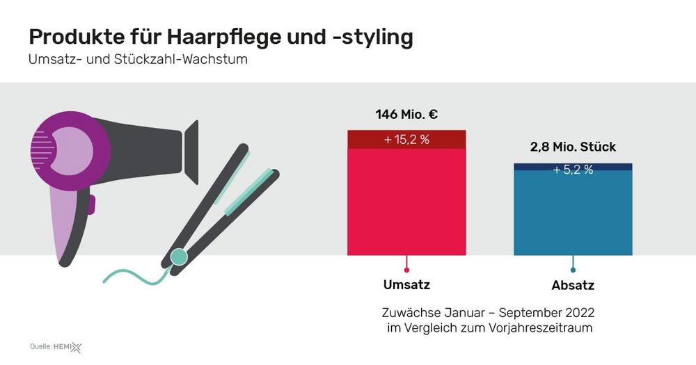 Nach der Rückkehr des sozialen Lebens sind Haar-Styling-Geräte nun jedoch wieder stark nachgefragt und konnten ihren Umsatz im ersten Halbjahr 2022 folglich um 18 Prozent steigern. Dies lässt sich über alle Segmente hinweg in einem ähnlichen Ausmaß beobachten: So verzeichnen Warmluft-Styler im Vergleich zum ersten Halbjahr 2021 ein Umsatzplus von 17 Prozent, Lockenstäbe steigerten ihren Umsatz um 22 Prozent und auch Glätteisen legten um 18 Prozent zu. Der Aufwärtstrend setzte sich auch im dritten Quartal fort, sodass sich für den Zeitraum Januar bis September ein Stückzahlwachstum um 5,2 Prozent auf mehr als 2,8 Millionen Hairstyling-Geräte und ein Umsatzzuwachs von 15,2 Prozent auf mehr als 146 Millionen Euro ergeben.