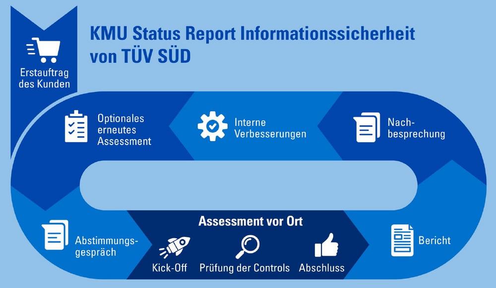 Der KMU Status Report Informationssicherheit wurde von unabhängigen TÜV SÜDExperten nach dem Grundsatz „Konzentration auf das Wesentliche“ entwickelt und ist nicht an eine Zertifizierung gekoppelt. Der Prüfkatalog umfasst grundsätzliche Anforderungen, von organisatorischen Aspekten bis hin zur Technikausstattung in der IT. Die Basis dafür ist unter anderem der internationale Standard ISO/IEC 27002, der eine umfangreiche Sammlung der etablierten Sicherheitsmaßnahmen darstellt. Das Assessment richtet sich an Unternehmen mit bis zu 250 bzw. 500 Mitarbeitenden, deren Hauptzweck nicht in der Bereitstellung oder dem Betrieb von ITSystemen liegt.