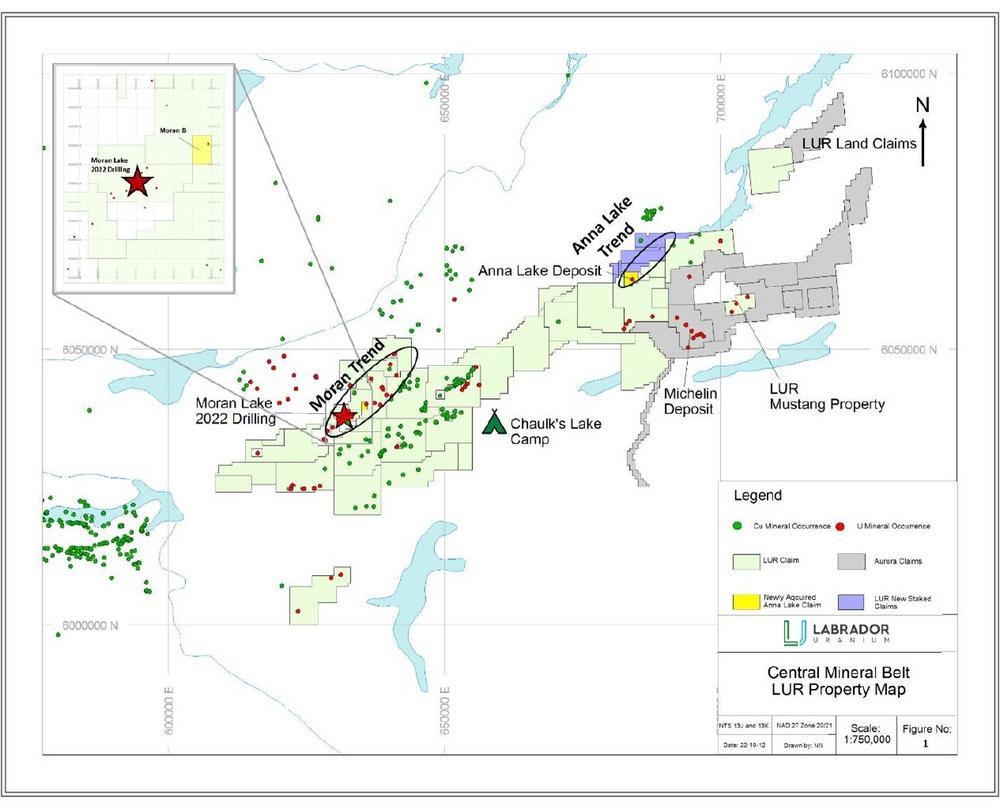 Labrador Uranium is engaged in the exploration and development of uranium projects in Labrador, Canada and holds a dominant land position with 52 Mineral Licences covering 152, 865 ha in the prolific Central Mineral Belt (CMB) in central Labrador and the Notakwanon Project in northern Labrador. Currently, the Company is advancing the district scale CMB Project which includes the Moran Lake Deposit and Mustang Lake Project. The CMB Project area surrounds several known uranium prospects, including Paladin Energy’s Michelin deposit, with substantial past exploration work completed, and numerous occurrences of uranium, copper and IOCG style mineralization.