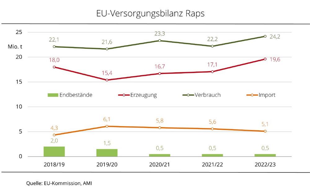 Der Gesamtverbrauch der EU-27 wird bei 24,2 Mio. t und damit rund 9 % über Vorjahreslinie gesehen. Der Bedarf der Ölmühlen wird dabei auf 23,3 Mio. t geschätzt, ebenfalls ein Plus von knapp 9 % gegenüber 2021/22. Im Vorjahr konnte der EU-Verarbeitung zu knapp 80 % aus europäischer Erzeugung gedeckt werden. 2022/23 könnte der Anteil voraussichtlich auf gut 84 % steigen. Die EU-Kommission geht deshalb davon aus, dass im laufenden Wirtschaftsjahr weniger Raps eingeführt werden muss. Die Importschätzung liegt bei 5,1 Mio. t und damit um 8 % unter dem Vorjahresvolumen. Die Lagerbestände bleiben gegenüber dem Vorjahr voraussichtlich unverändert bei einem unterdurchschnittlichen Wert von 0,5 Mio. t.