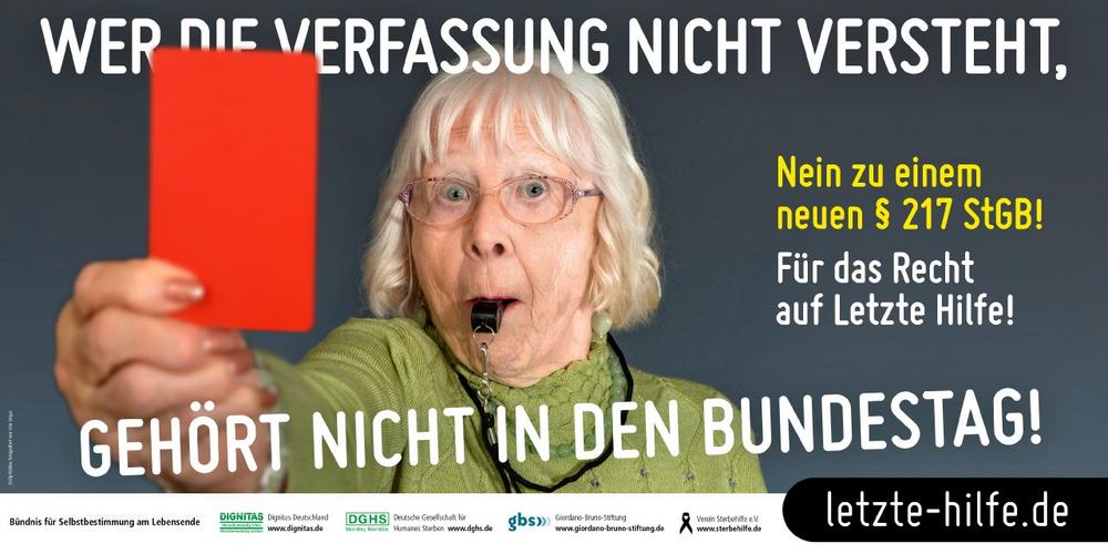 In dem Anschreiben an die 140 mit einer gelben Karte verwarnten Bundestagsabgeordneten heißt es dazu: „Sie haben 2015 für den verfassungswidrigen § 217 StGB gestimmt und möglicherweise erwägen Sie nun abermals, das Recht auf Selbstbestimmung am Lebensende in gravierender Weise einzuschränken. Deshalb erinnern wir Sie mit der beigefügten gelben Karte daran, dass Sie 2015 ein grobes Foul am demokratischen Rechtsstaat begangen haben, für das Sie am 26. Februar 2020 vom Bundesverfassungsgericht eindringlich verwarnt wurden. Einmal kann ein solches Malheur passieren. Wer aber zweimal den gleichen Fehler begeht, legt eine Form von Ignoranz gegenüber Grundrechten und Justiz an den Tag, die mit den Spielregeln einer Demokratie schwerlich in Einklang zu bringen ist!“