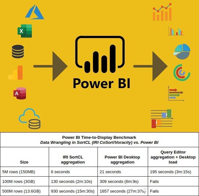 Power BI mit mehr Power: Wenn Sie mehrere oder hochvolumige Datenquellen erfassen, integrieren, bereinigen oder maskieren müssen, sollten Sie dies außerhalb der BI-Schicht tun! Das Programm SortCL im IRI CoSort Paket oder die Datenmanagement-Plattform IRI Voracity wickelt schnell und kostengünstig große, rohe Datenquellen im Dateisystem (nicht im SQL Server) ab. Durch die Zentralisierung der Vorverarbeitungsarbeit von Sortier-, Joint- und Aggregattransformationen in SortCL wird dieser Overhead aus Power BI entfernt und die Zeit bis zur Anzeige und Einsicht drastisch verkürzt.