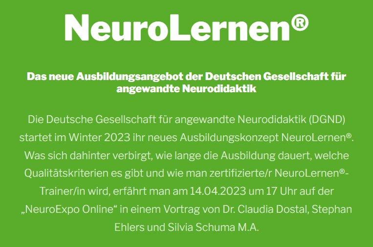 Die Deutsche Gesellschaft für angewandte Neurodidaktik e.V. – DGND startet im Winter 2023 ihr neues Ausbildungskonzept NeuroLernen®. Was sich dahinter verbirgt, wie lange die Ausbildung dauert, welche Qualitätskriterien es gibt und wie man zertifizierte/r NeuroLernen®-Trainer/in werden kann, erfährt man am 14.04.2023 um 17 Uhr auf der NeuroExpo Online.