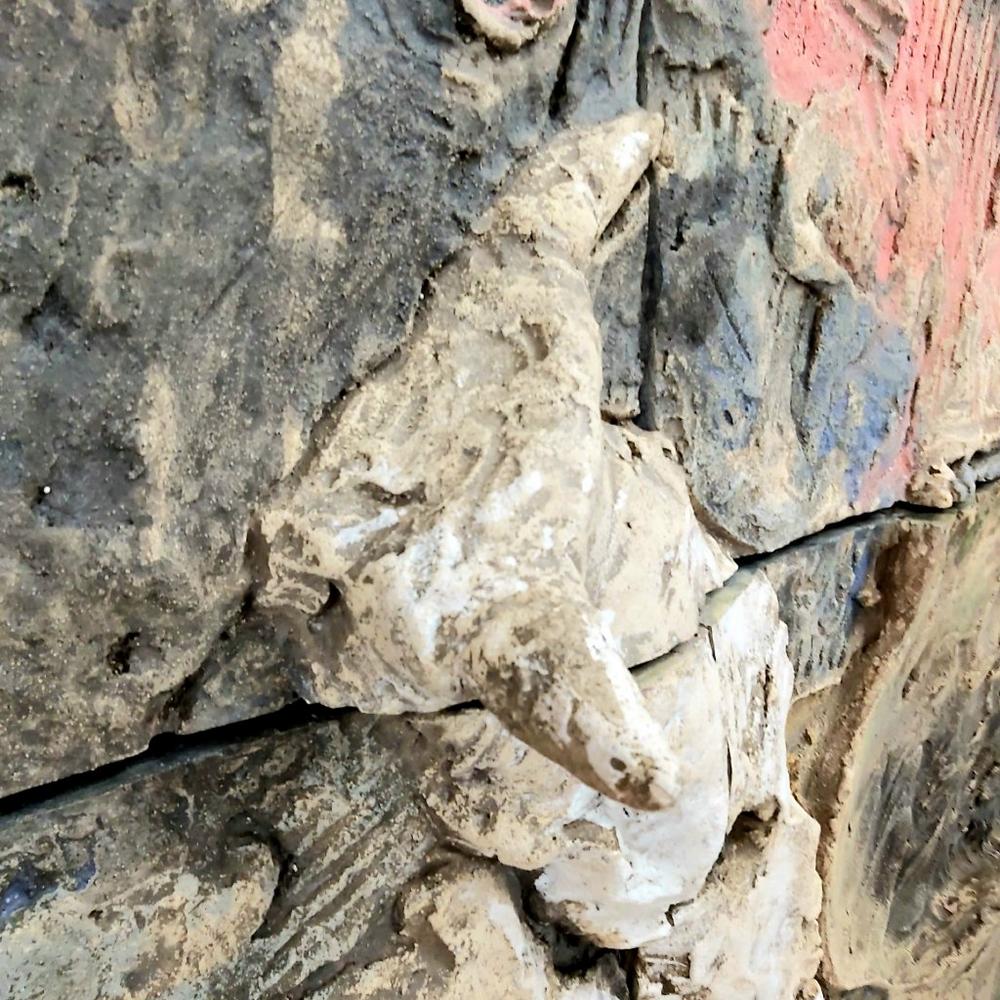 Richtig kräftig und die Tonplatten stark überragend modellierte und formte Markus Lüpertz die 14 Kunstwerke für die neue Karlsruher U-Bahn. Figuren und Symbole ragen teilweise deutlich aus dem angedachten Rahmen heraus. Dies war seinem Elan und seiner Freude an diesem besonderen Gesamtkunstwerk geschuldet.