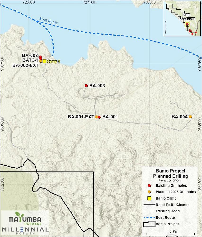 Preparations for the upcoming drill program at Banio are ongoing including complete rehabilitation of the camp, establishing internet services and clearing of 4km of drill roads and drill pad access. In the Phase 2a program historic holes BA-001 and BA-002 will be extended 350m and 55m respectively to test the presence of additional potash cycles. Hole BA-004, located approximately 4 km east of BA-001 will be drilled to 700m depth in an effort to intersect and evaluate the entire evaporite sequence comprised of cycles II to IX. Drilling is expected to commence in Q3, 2023 and completed in Q4.