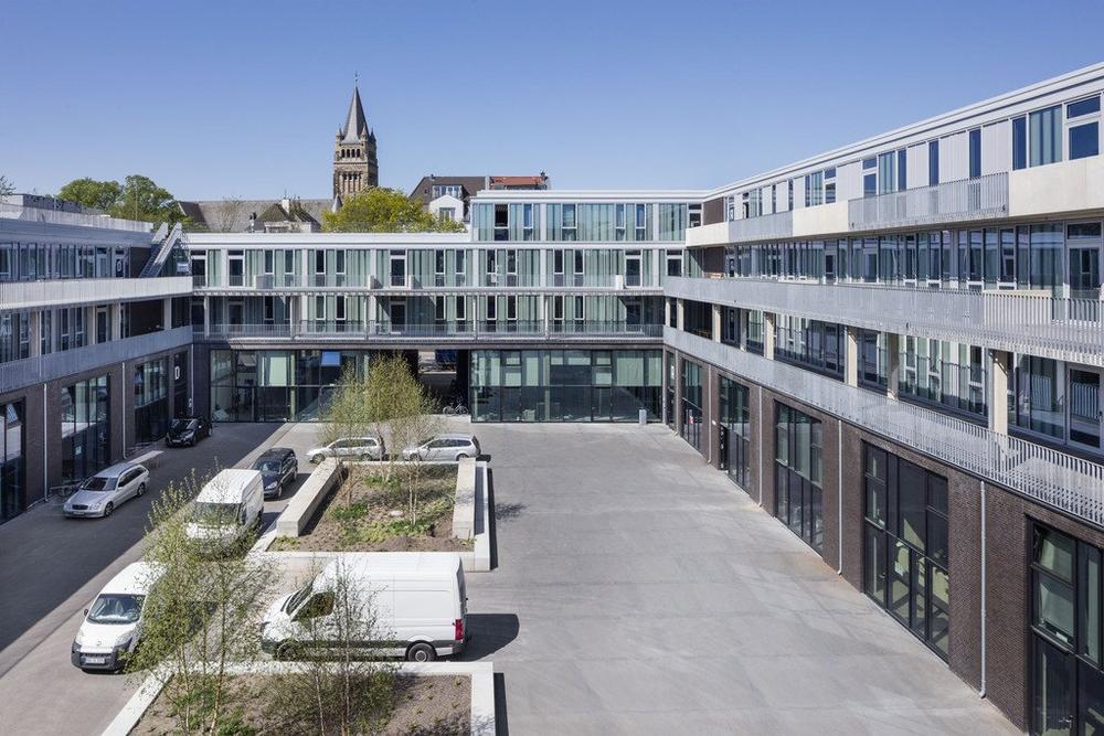 Dem Neubau, der sich mit verglasten Geschossen über der historischen Ziegelfassade erhebt, könnte die Rolle als „Veedel im Veedel“ (Kölsches Wort für Viertel) zukommen. Auf 18.000 qm Fläche bietet er Platz für Gewerbe u.a. für Büros, Kita, Hotel und Gastronomien sowie Künstlerateliers. Clouth 104 soll die Menschen auf der Dachterrasse, in den Laubengängen oder im begrünten Innenhof miteinander vernetzen. Die großzügigen, loftartigen Räume sind mit nur wenigen Wänden erstellt und werden in variablen Modulen je nach gewünschtem Platzbedarf vermietet.