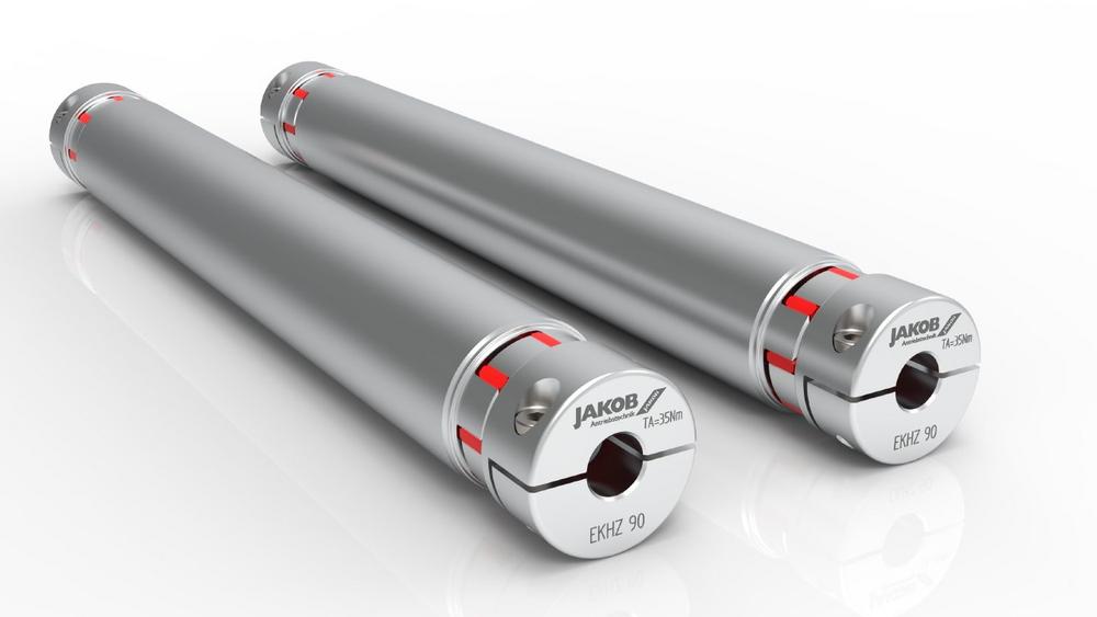 In addition to the connecting shafts Simple-Flex, WD, WDS, WDZ, WDB and WD-VA, Jakob also offers another series called EKHZ as well as tailor-made solutions for bridging large center distances. The EKHZ series is based on elastomer couplings from the EKH series and is designed for applications with medium operating speeds. It covers a torque range of 20 to 1600 Nm and enables maximum speeds of 3500 rpm with a minimum length of 50 cm. The coupling is suitable for shaft diameters from 8 to 100 mm. As a rule, the maximum available length of the EKHZ is up to three meters.
