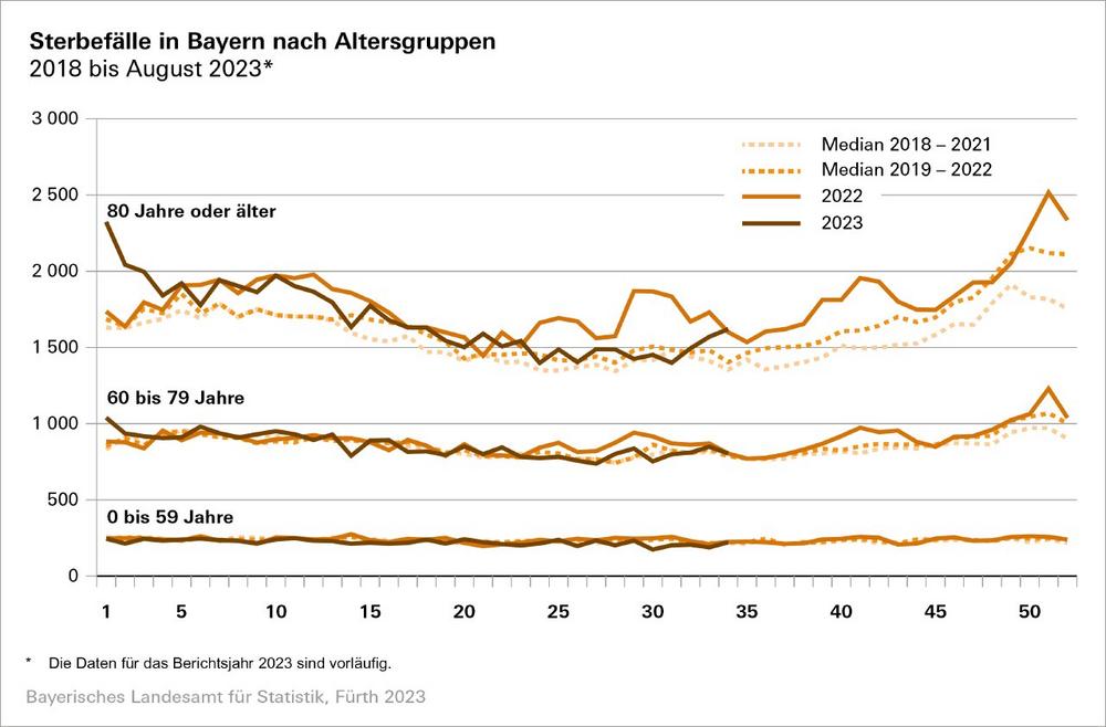 Bei Personen unter 60 Jahren verzeichnet das Bayerische Landesamt für Statistik im Betrachtungsmonat einen Rückgang der Sterbefälle um rund sieben Prozent. Bei der Gruppe der 60 bis unter 80-Jährigen und den 80-Jährigen und Älteren liegen die Sterbefallzahlen zwei Prozent bzw. knapp fünf Prozent über dem Median der Jahre 2019 bis 2022.