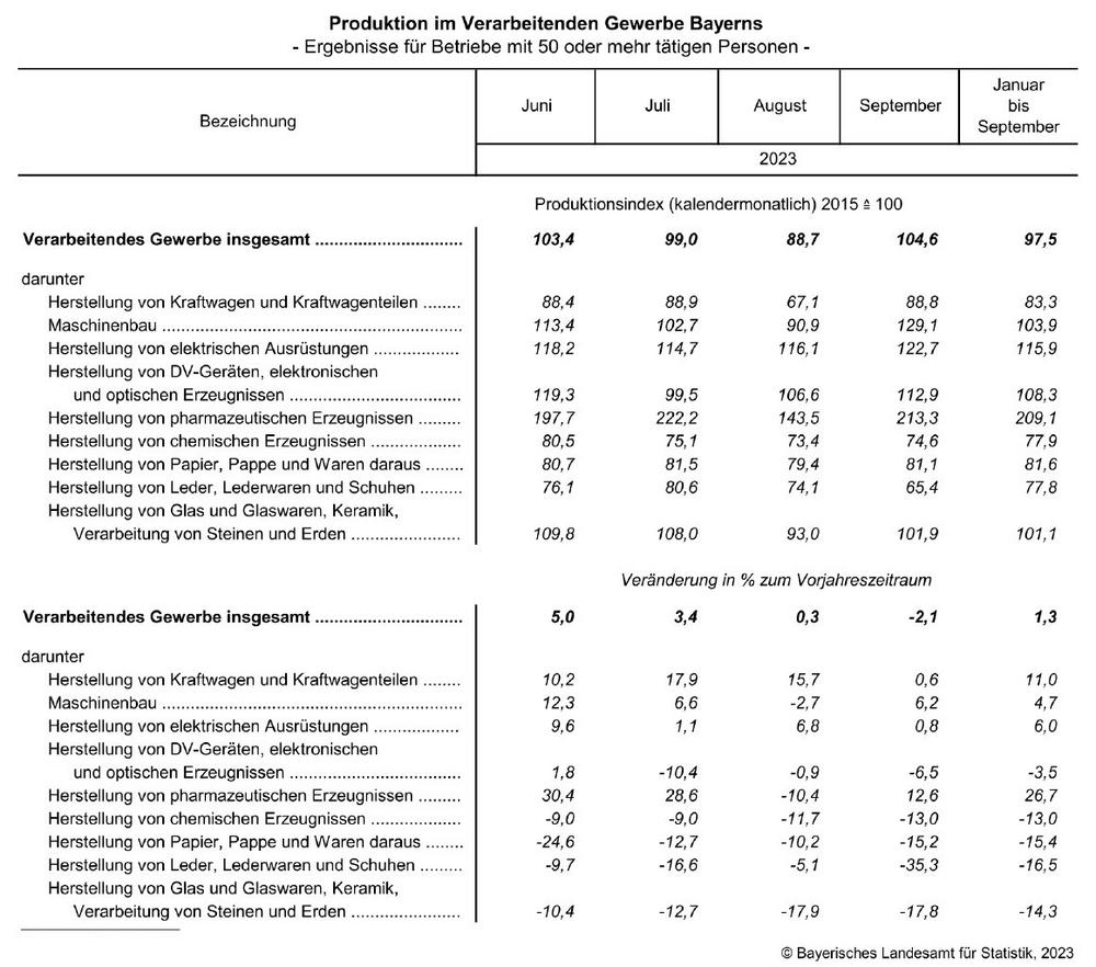 Fürth. Die Produktion der bayerischen Industrie (Verarbeitendes Gewerbe sowie Bergbau und Gewinnung von Steinen und Erden, bezogen auf den Berichtskreis „Betriebe mit 50 oder mehr Beschäftigten“) verzeichnet im September 2023 gegenüber dem Vorjahresergebnis ein Minus von 2,1 Prozent. Wie die Fachgruppe des Bayerischen Landesamts für Statistik weiter mitteilt, steigt die Produktion bei den Investitionsgüterproduzenten um 1,8 Prozent. Bei den Vorleistungsgüterproduzenten (-6,9 Prozent) und im Verbrauchsgütersektor (-4,4 Prozent) geht sie dagegen zurück.