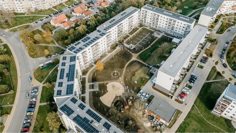 Im Quartier Walther-Grosse-Ring 22-25 können die Mieter noch mehr von Nachhaltigkeit profitieren. Denn die GWW hat die Sanierung mit der flächendeckenden Bebauung der Plattenbaudächer mit Photovoltaik-Platten kombiniert. Auch alle weiteren Plattenbaudächer der GWW sollen zukünftig mit PV-Anlagen ausgerüstet werden.