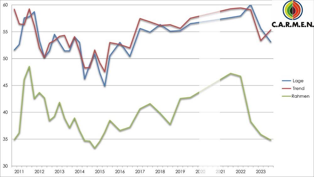 Der Abwärtstrend bei der Einschätzung der politischen Rahmenbedingungen hat sich etwas verlangsamt. Das Stimmungshoch des vergangenen Jahres hat sich aufgelöst, und der Indexwert bewegt sich wieder auf dem Niveau der Krisenjahre 2014 und 2015. Hintergrund dürfte sein, dass derzeit die Nutzung Nachwachsender Rohstoffe sowohl im stofflichen als auch im energetischen Bereich in der politischen Diskussion eher problematisiert als wertgeschätzt wird. Während die bestehenden Regelwerke bereits viele Auflagen und Verpflichtungen beinhalten, deuten sich am Horizont mit der bis 2025 in nationales Recht umzusetzenden EU-Richtlinie RED III sowie der ebenfalls längerfristig Leitplanken vorgebenden Nationalen Biomasse-Strategie (NABIS) weitere Herausforderungen an. Insofern ist mittelfristig nicht zu erwarten, dass in der Branche ein Stimmungsumschwung hinsichtlich der