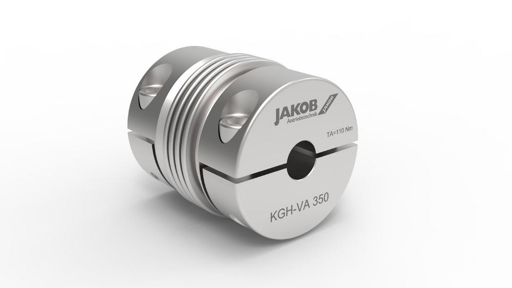 JAKOB Antriebstechnik bietet die Metallbalgkupplung KGH, die in der äußerst montagefreundlichen Halbschalennabenausführung gefertigt wird, auch als Edelstahlvariante an (KGH-VA). Montage und Demontage der Kupplung sind so selbst in beengten Einbauverhältnissen keine Schwierigkeit mehr. Die festen Nabenhälften werden auf die Welle aufgelegt und mit den losen Halbschalenstücken verschraubt. Gerade bei feststehenden Wellenzapfen kann der Servicefall bedeuten, dass die Antriebs- und/oder Abtriebseinheit umständlich demontiert werden müssen, was somit entfällt. Durch die rostfreie Edelstahlbauweise ist sie auch für Einsätze im Lebensmittelbereich und der Medizintechnik hervorragend geeignet.