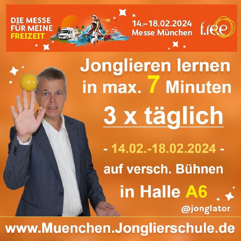 Stephan Ehlers ist der aktuelle Weltrekordhalter im Jonglieren-Lernen und lädt die Messebesucher mehrfach täglich ein, auf verschiedenen Bühnen das „Jonglieren lernen in nur 7 (sieben!) Minuten“ auszuprobieren. Die Teilnahme ist kostenfrei und wem es gelingt, gewinnt sogar ein professionelles Jonglierball-Set im Wert von 24,90 €.
