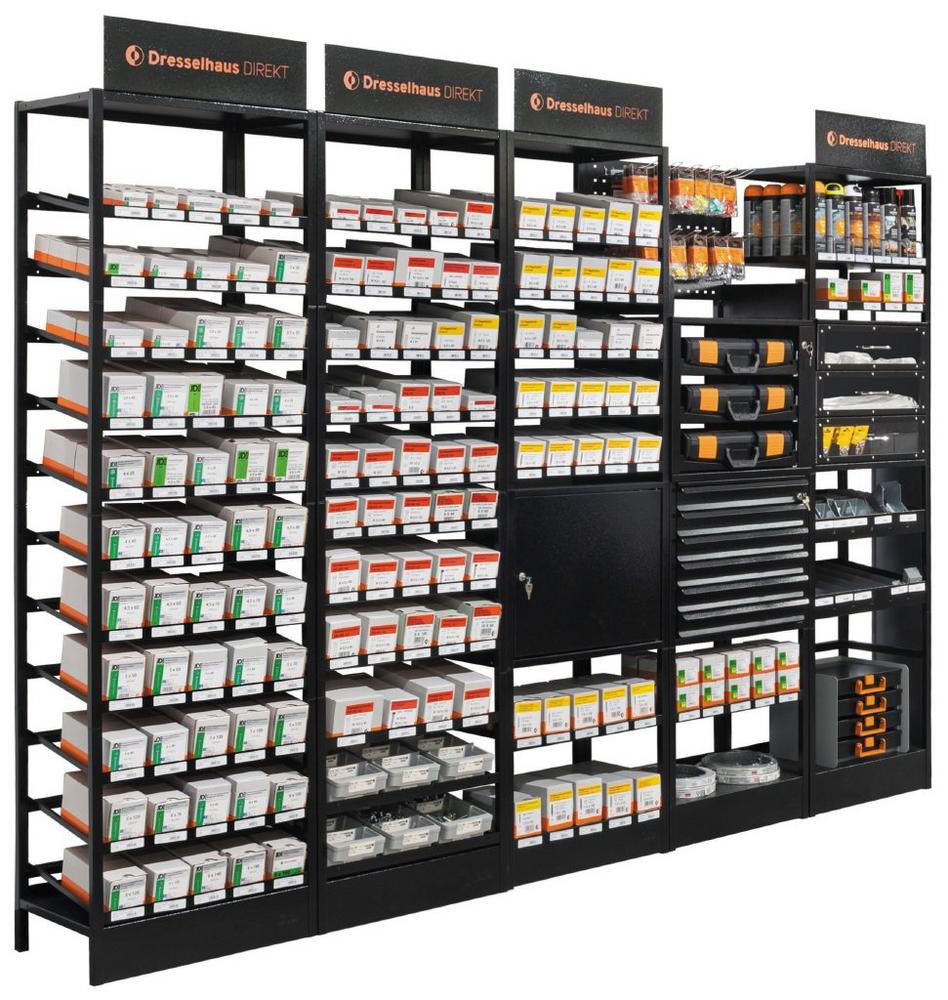 Das Angebot ergänzen branchengerecht vorkonfigurierte Varianten: Aktuell erhältlich sind das DIREKTblack Regal DINO, vollständig bestückt mit DIN- und Normteilen, der Basisausstattung der Dresselhaus-Produkte: metrische Schrauben, Muttern, Scheiben, Federringe und Weiteres. Das DIREKTblack Regal DACH ist speziell für Dachdecker konfiguriert und enthält typische Artikel wie Spengler-, Konstruktions- und Universalschrauben aus dem Dresselhaus-Sortiment. Auch hier sorgen Mehrwertsticker mit Barcodes für eine rasche Erfassung zwecks Nachbestellung.