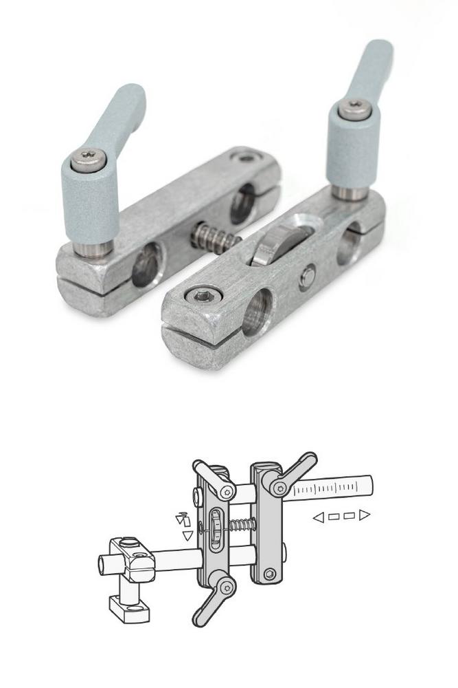 Extrem flexibel in der Anwendung: Durch Verdrehen einer der beiden Klemmhalter und oder Tausch der Klemmstellen können unterschiedlichste Anforderungen ganz einfach bei der Montage berücksichtigt werden. Die Klemmung selbst erfolgt standardmäßig entweder über zwei farblich differenzierte Zylinderschrauben oder werkzeuglos mittels zweier verstellbarer Klemmhebel. Bei zusätzlichem Bedarf können verstellbare Klemmhebel als Zubehör separat hinzu bestellt werden.