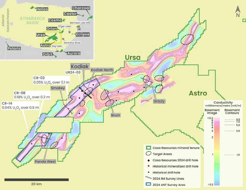 Andy Carmichael, VP of Exploration, kommentierte: "Wir freuen uns, dass wir die Datenerfassungsphase unseres geophysikalischen Programms abgeschlossen haben, das drei Arten von Untersuchungen umfasst, um vier unserer wichtigsten Uranprojekte voranzubringen. Cosa erwartet, dass die Ergebnisse der umfangreichen Ambient Noise Tomography (ANT)-Arbeiten bei Ursa rechtzeitig vorliegen werden, um die Bohrungen zu leiten und die ermutigenden Ergebnisse der Bohrungen im Winter 2024 weiterzuverfolgen und die Priorisierung der Zielgebiete auf diesem 60.000 Hektar großen Projekt zu unterstützen. Wir freuen uns auf die ANT-Ergebnisse von Orion, wo die Arbeiten im Jahr 2023 überzeugende übereinstimmende leitfähige Sandstein- und Grundgebirgsanomalien aufzeigten, sowie auf die luftgestützten Gravitations- und elektromagnetischen Ergebnisse bei Aurora und Orbit, die die Exploration dieser oberflächennahen Projekte in der Nähe der Uranmühle Key Lake im Jahr 2025 bestimmen werden."