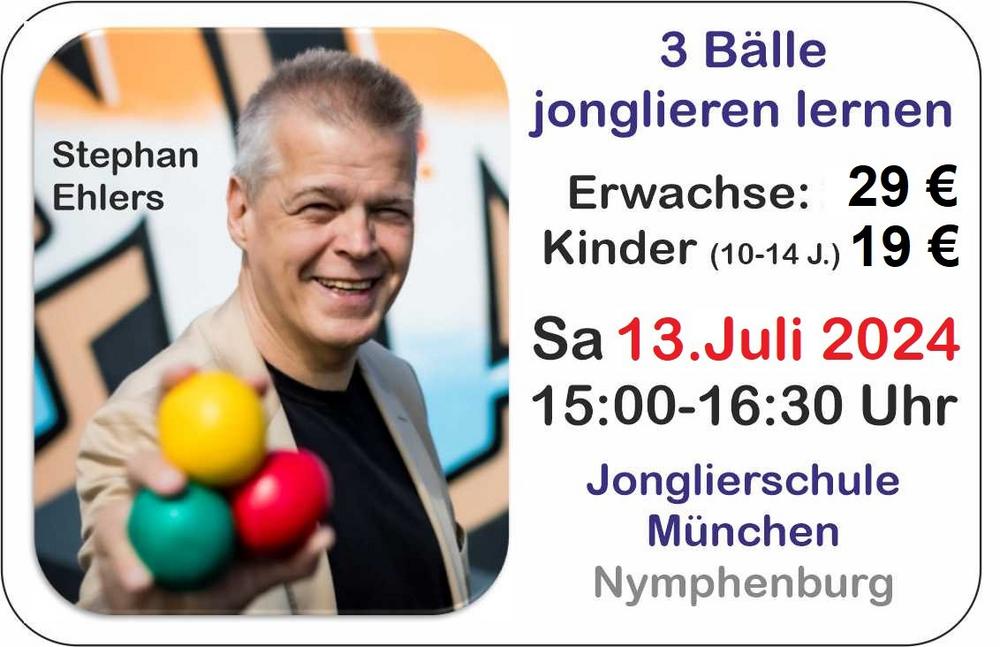 In diesem Live-Präsenz-Workshop der Jonglierschule München werden absolute Anfänger in verblüffend kurzer Zeit das Grundmuster der Dreiball-Jonglage erlernen. Hierzu sind keinerlei Vorkenntnisse erforderlich. Der Kurs ist für Kinder und Erwachsene. Das Mindestalter sollte 10 Jahre sein. Eine tolle Idee zum Verschenken oder selbst nutzen.