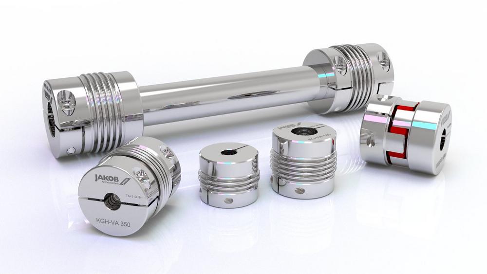 Die JAKOB Antriebstechnik GmbH bietet fünf verschiedene Edelstahlkupplungen als Standardbaureihen an: die Metallbalgkupplungen KG-VA, KGH-VA und MKG-VA, die Distanzkupplungsreihe WD-VA sowie die Elastomerkupplung EKM-VA. Besonders hervorzuheben ist, dass sowohl die Metallbalgkupplung KGH-VA als auch die WD-VA-Reihe in einer sehr montagefreundlichen Halbschalennabenausführung gefertigt werden. Diese Konstruktion ermöglicht eine einfache Montage und Demontage, selbst unter beengten Platzverhältnissen. Die festen Nabenhälften werden einfach auf die Welle aufgelegt und mit den losen Halbschalenstücken verschraubt. Dies spart insbesondere bei feststehenden Wellenzapfen Zeit, da die aufwendige Demontage der Antriebs- und/oder Abtriebseinheit entfällt. Dank ihrer rostfreien Edelstahlkonstruktion sind diese Kupplungen auch ideal für den Einsatz im Lebensmittelbereich geeignet.