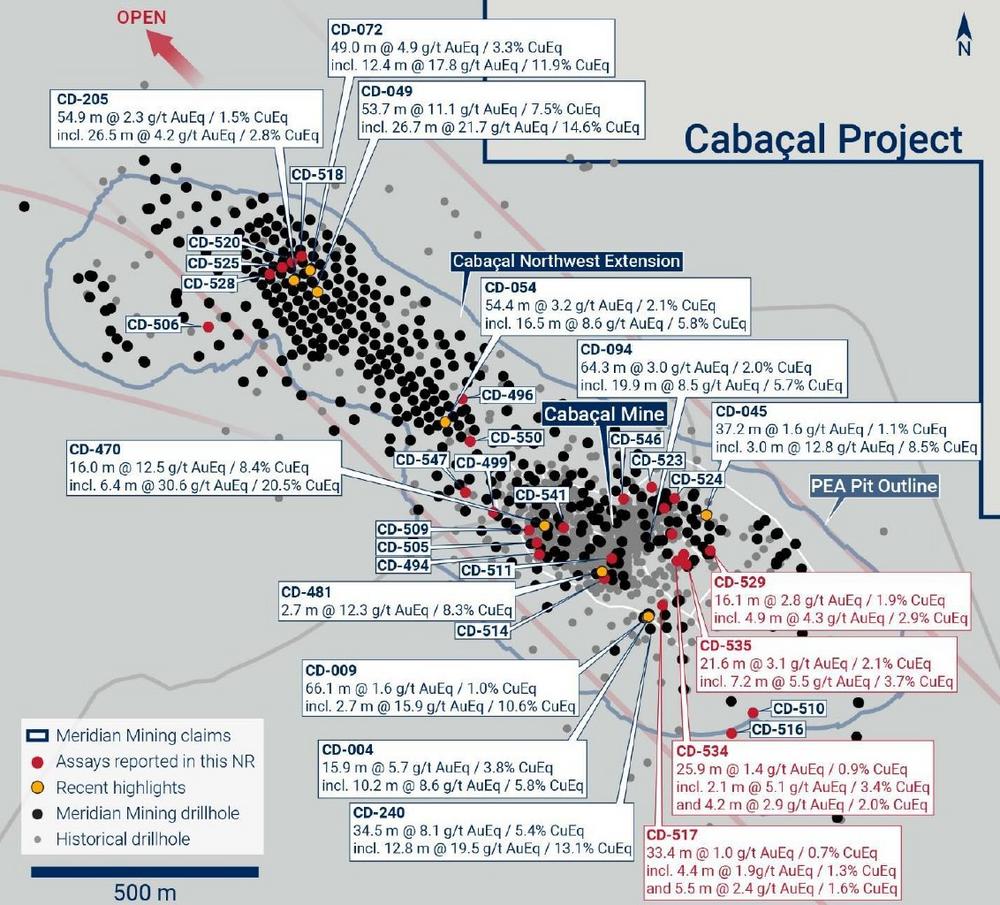 Meridian Mining UK S (TSX: MNO), (Frankfurt/Tradegate: 2MM) (OTCQX: MRRDF) (“Meridian” or the “Company”) – https://www.commodity-tv.com/ondemand/companies/profil/meridian-mining-uk-societas/ – is pleased to announce further strong results from its Cabaçal Cu-Au-Ag project (“Cabaçal”). Wide zones of Cu-Au-Ag mineralization continue to be defined, highlighted by CD-535 returning 21.6m @ 3.1g/t AuEq / 2.1% CuEq, and CD-529 returning 16.1m @ 2.8g/t AuEq / 1.9% CuEq (“Figure 1”), within the open pit area[1]. Further results from Cabaçal, Santa Helena and the Mine Corridor drill programs are pending.