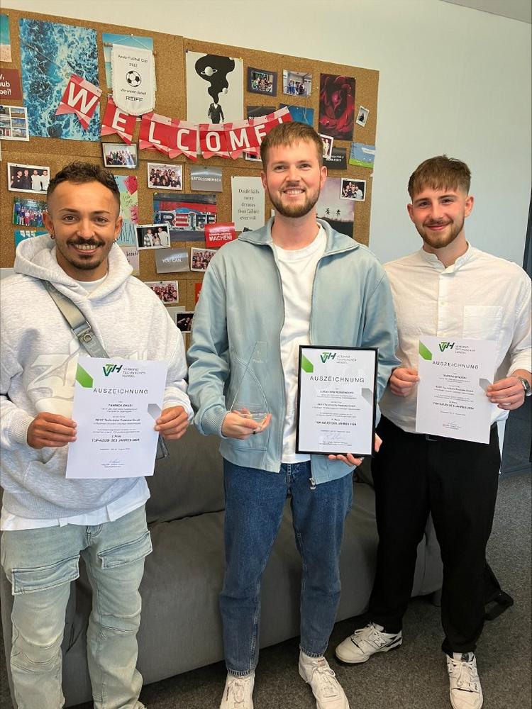 Yannick Zuhdi (Fachkraft für Lagerlogistik) und Sandro Spadoni (Industriekaufmann) haben ihre Ausbildung mit der Note „gut“ abgeschlossen und dafür vom VTH ein Preisgeld in Höhe von jeweils 200 Euro erhalten. Lukas van Rossenberg (Fachinformatiker, Fachrichtung Systemintegration) hatte eine „sehr gut“ auf seinem Abschlusszeugnis stehen und durfte sich deshalb über 500 Euro Preisgeld freuen.
