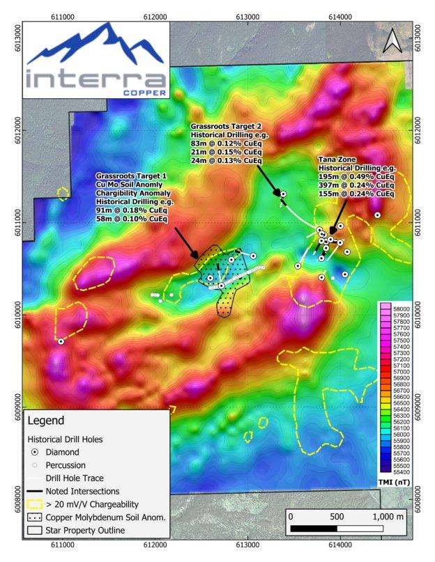 Die zuletzt getätigten historischen Ausgaben auf dem Konzessionsgebiet Star belaufen sich auf über $2.612.422*** und begannen im Jahr 1999, als Imperial Metals das Konzessionsgebiet als potenzielles Gegenstück zu der damaligen Huckelberry (Minen)-Entdeckung einschätzte. Der technische Berater von Interra, Tony Barresi, Ph.D., P.Geo., hat die Daten, die in diesen Jahren der Exploration gewonnen wurden, überprüft und ein neues Explorationsmodell entworfen. Historische Bohrarbeiten auf einem Gebiet von 1,8 x 1,0 km deuten an, dass das Konzessionsgebiet Star von einer großen veränderten und schwach mineralisierten Intrusion unterlagert wird. Die Tana-Zone, wo die hochgradigsten Bohrabschnitte angetroffen wurden, ist die einzige Stelle, wo Bohrarbeiten (unbeabsichtigt) den Kontakt zwischen der Intrusion und dem umgebenden Vulkangestein getestet haben. Das neue Modell konzentriert sich darauf, diesen Kontakt zu lokalisieren und Bereiche mit überlappenden Explorationsindikatoren zu untersuchen, darunter Step-out-Bohrungen entlang des definierten Kontakts bei der Tana-Zone und mehrere andere „Grassroots“-Zielgebiete mit hoher Priorität.