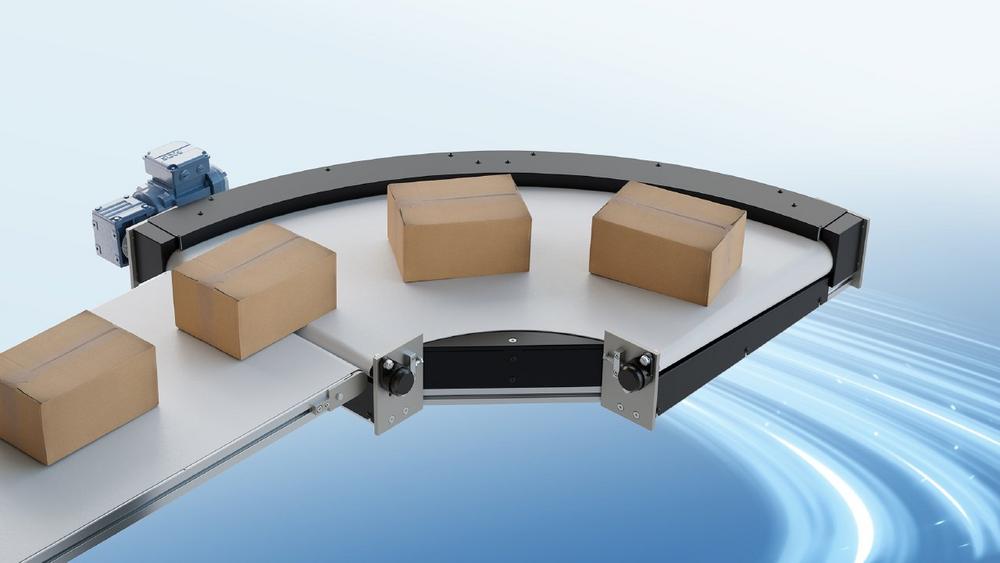 Er ermöglicht den Kurventransport 90° von Stückgut, wie z.B. Kartonagen, Kleinladungsträgern oder Trays, bis zu einer Gesamtlast von 50 kg, wobei die Ausrichtung der Produkte beibehalten wird. Der Förderer ist in Aluminiumprofilbauweise ausgeführt und kompatibel zu allen weiteren Fördersystemen von mk.