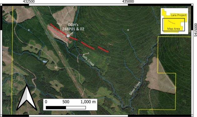 Das Bohrloch 24BP02 durchteufte auf den ersten 0,9 Metern (2,95 Fuß) Massivsulfide, die aus braunem Sphalerit, Bleiglanz, Chalkopyrit und Pyrit bestehen. Dieser Abschnitt lieferte bei der Analyse 3,16 g/t Au, 462 g/t Ag, 46,03 % Zn, 7,54 % Pb und 2,13 % Cu. Die verbleibenden 1,5 Meter (4,9 Fuß) durchschnitten zerklüfteten/ abgelagerten Kalkstein (Marmor) mit einer Matrix aus Sulfiden u.a. bestehend aus braunem Sphalerit, Bleiglanz, Chalkopyrit und Pyrit. Die Analyse dieses Abschnitts ergab 1,375 % Zn, 0,56 % Pb, 0,515 % Cu, 0,479 g/t Au und 165 g/t Ag.