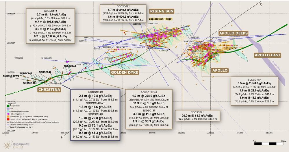 Michael Hudson, President & CEO of SXGC states: "At this early stage of drilling at Christina, our systematic approach continues to deliver high grades while we increase the volume of the system. The discovery of six new vein sets extends our mineralized footprint by 15% or 200 m westward from the historic Christina mine. The project’s mineralized strike length now spans 1.5 km from Apollo East to Christina, and importantly, remains open to the east of Apollo, to the west of Christina and down-dip across the project.
