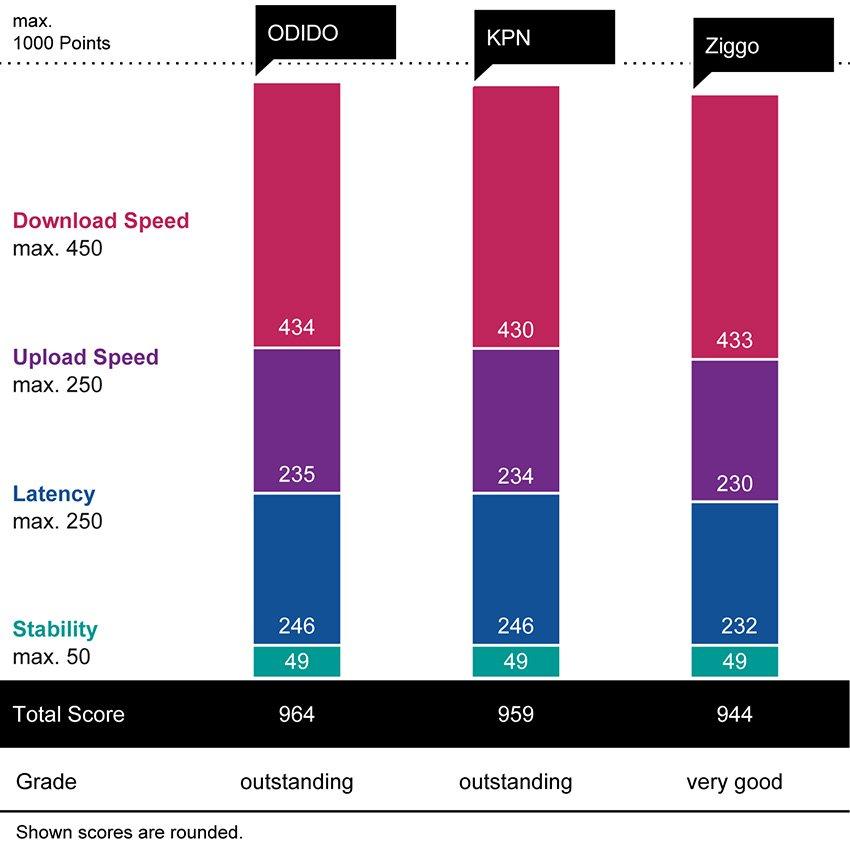 Ziggo ranks third with 944 points and the overall grade “very good”. The operator achieves very strong results in the category Download Speed, scoring one point behind Odido. In the category Stability, the results of all three nationwide operators are on the same level.