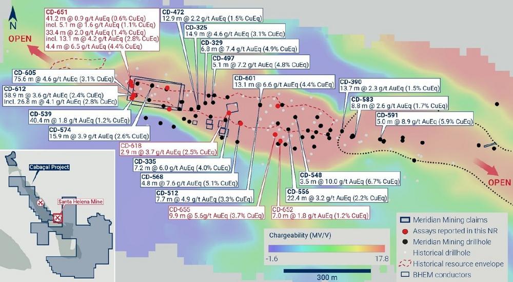 Meridian Mining UK S (TSX: MNO), (Frankfurt/Tradegate: 2MM) (OTCQX: MRRDF) (“Meridian” or the “Company”) – https://www.commoditytv.com/… – is pleased to announce that it has drilled laterally into a VMS pile hosting Cu-Au-Zn & Ag massive to semi-massive sulphides on the western limit of the Santa Helena Au-Cu-Ag & Zn deposit “Santa Helena”. CD-651 returned 33.4m @ 2.0g/t AuEq (1.4% CuEq) including 13.1m @ 4.2g/t AuEq (2.8% CuEq). Potential exists for further Cu-Zn-Au rich domains to the west, where it is considered open. Drilling continues and further results are pending.