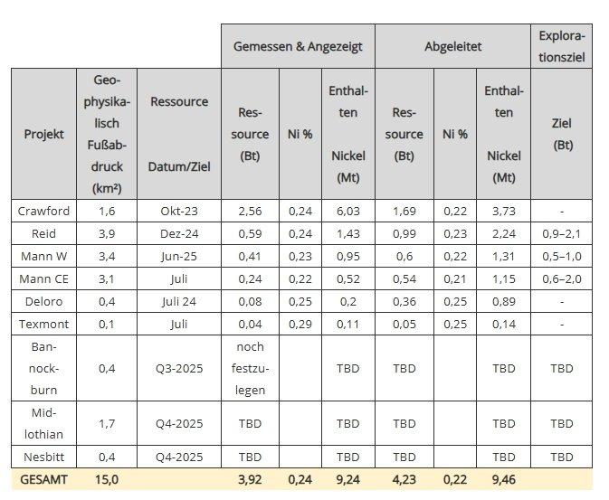 Das Explorationsziel wurde durch Modellierung der identifizierten Nickelsulfidmineralisierung innerhalb des aktuellen Schätzungsbereichs, jedoch außerhalb des aktuellen MRE-Gebiets, abgeleitet. Das Volumen des modellierten Explorationszielgebiets bestimmt die potenzielle Tonnageangabe im Explorationsziel. Der im Explorationsziel angegebene Gehaltbereich wurde unter Berücksichtigung der Bohrkernresultate innerhalb des modellierten Explorationszielgebiets, unter Berücksichtigung der geologischen Gegebenheiten in einem gut erforschten Nickel-Lagerstättentyp, in dem Gehalte beobachtet werden und gut verstanden sind, sowie auf der Grundlage der Erfahrung des Unternehmens und der qualifizierten Personen ermittelt. Die potenziellen Tonnagen und Gehalte sind konzeptioneller Natur und basieren auf Bohrlöchern und geophysikalischen Ergebnissen, die die ungefähre Länge, Mächtigkeit, Tiefe und den Gehalt des Explorationsziels definieren. Die Exploration ist noch nicht ausreichend, um eine aktuelle Mineralressource zu definieren, und das Unternehmen weist darauf hin, dass das Risiko besteht, dass weitere Explorationen nicht zur Abgrenzung einer aktuellen Mineralressource führen werden.