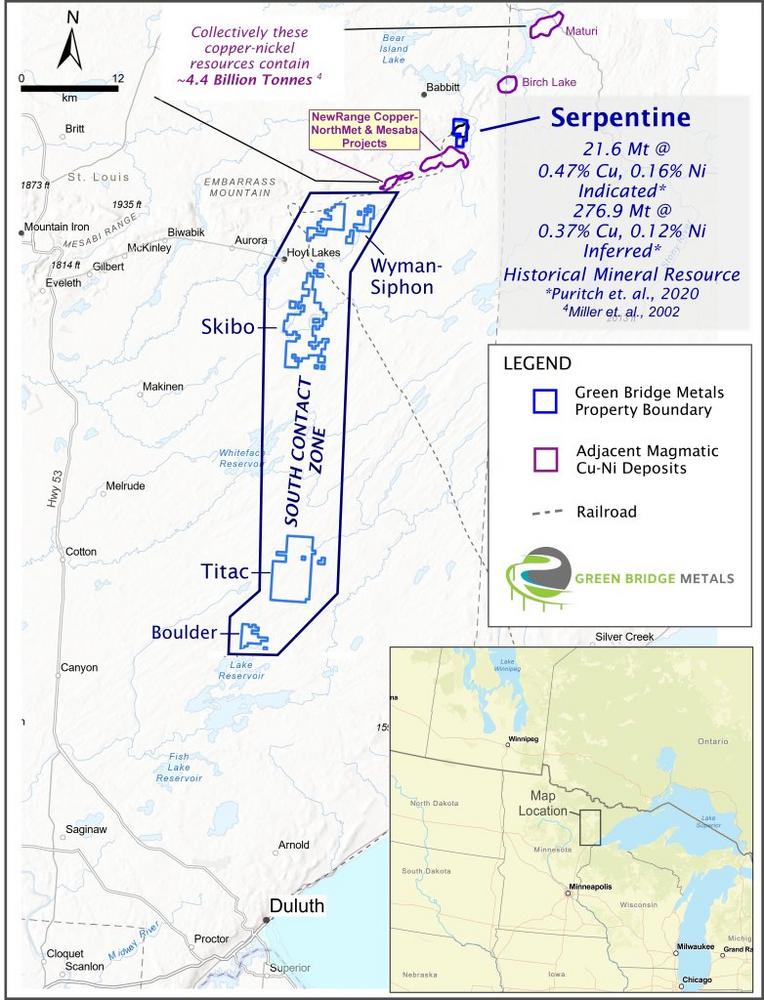 David Suda further stated: “Never before public, Serpentine is a highly strategic asset situated in the middle of what could potentially become one of the world’s largest and most important copper-nickel and other critical metals production hubs. There is currently strong momentum for domestic mining in the United States and the need for copper, nickel, cobalt and other critical metals is ever-present. By gaining access to Serpentine, Green Bridge combines the Company’s existing exploration upside at South Contact Zone with the development of Serpentine. With this Green Bridge offers investors leverage to significant opportunities with near-term catalysts and long-term value creation across multiple properties in North America.”