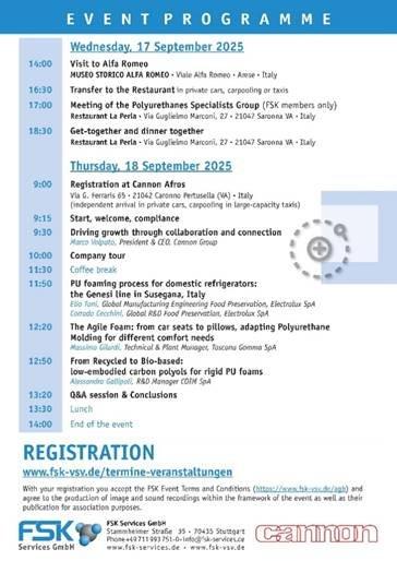 The two-day event begins on 17 September 2025 with a visit to the Alfa Romeo Museum in Milan, Arese. This will be followed by the internal FSK meeting of the association’s largest Polyurethanes. In particular, the election of the group spokespersons is on the agenda. Afterwards, all participants (including non-members) are invited to a cosy get-together and dinner together starting at 19:00 at the La Perla restaurant in Saronna.