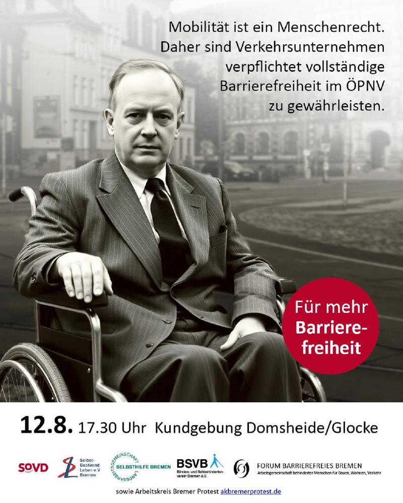 Mit ihrer Kundgebung wollen die Vertretungen behinderter Menschen deutlich machen, dass die Senatspläne zur Neugestaltung der Domsheide weiterhin auf massive Kritik stoßen. Die Planung des Senats, die in dem "Gestaltungsgremium Domsheide" in mehreren Sitzungen weiter konkretisiert worden sind, sollen am 12.08.2025 um 18:00 Uhr im kleinen Saal der Glocke der Öffentlichkeit vorgestellt werden.