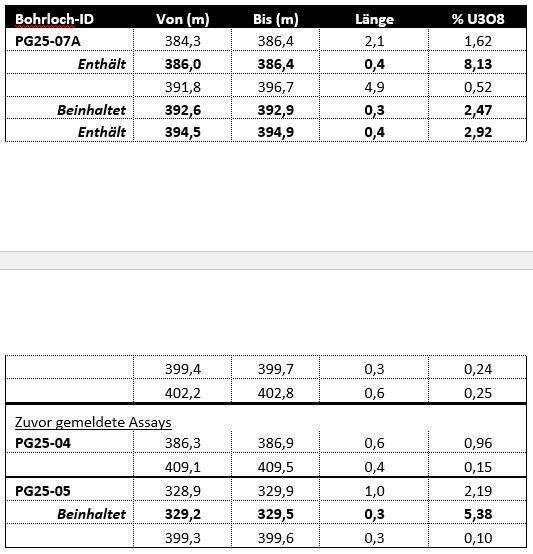 - Bohrloch PG25-07A durchteufte 0,4 Meter mit 8,1 % U₃O₈ innerhalb von 2,1 Metern mit 1,6 % U₃O₈ in der Entdeckungszone Nova. Das Bohrloch ergab außerdem weitere 4,9 Meter mit 0,52 % U₃O₈, darunter 0,4 Meter mit 2,9 % U₃O₈.