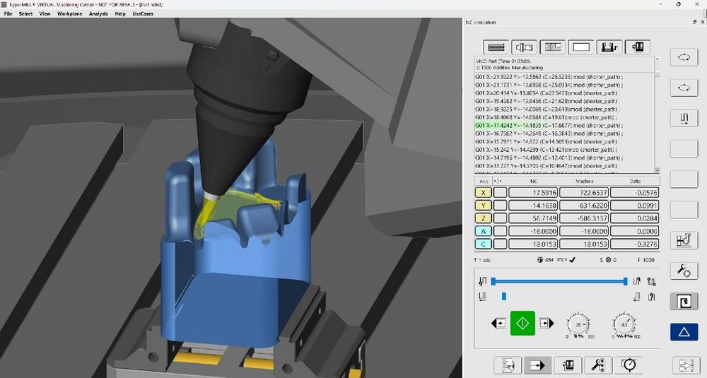 Abgesehen vom Sonderfall hybrider Maschinen, auf denen additive und subtraktive Fertigung direkt nacheinander erfolgen, verlangt die Nachbearbeitung die Ausrichtung eines Rohteils mit geringem Aufmaß in der Werkzeugmaschine. In der virtuellen Maschine von hyperMILL hat OPEN MIND mit der Funktion BEST FIT eine innovative Alternative zur manuellen Ausrichtung von Werkstücken für die Weiterbearbeitung bereitgestellt. Voraussetzung ist ein 5-Achs-Fräszentrum mit digitalem Messtaster. Das nicht ausgerichtete Rohteil wird auf der Maschine mit einer 3D-Messung angetastet und das Messprotokoll an das CAM-System gesendet. Die Software passt den NC-Code an die reale Bauteilposition an. So wird jetzt die virtuelle Welt der Programmierung an die reale Welt der Aufspannung angepasst.